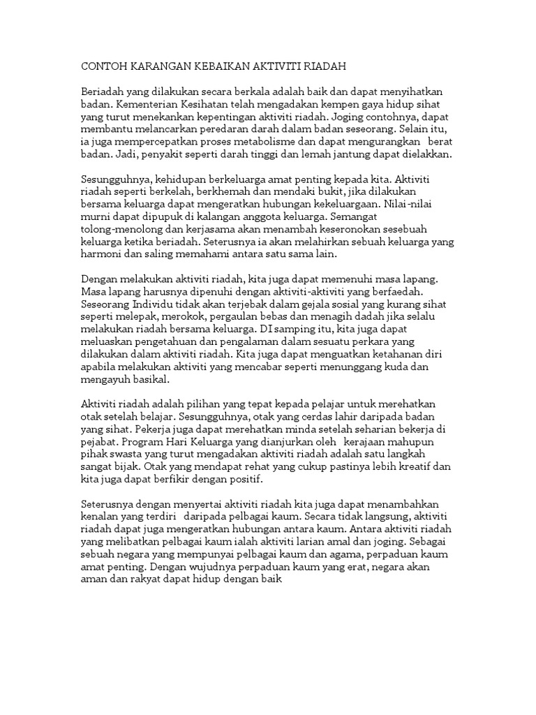 Gambar di bawah menunjukkan sebahagian daripada aktiviti riadah yang boleh dilakukan. 0 0 found this document useful Mark this document as useful. CONTOH KARANGAN LANGKAH MENINGKATKAN AKTIVITI RIADAH DALAM MASYARAKAT.